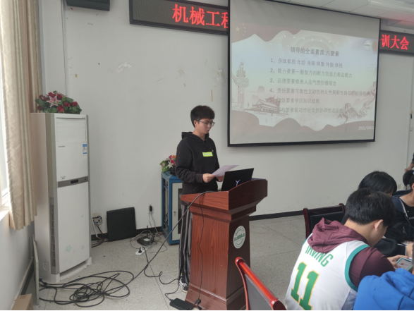 会议伊始,首先由文小华介绍本次会议的主要内容及目的,说明团员青年应不断提升自我的理论素养与实践能力,要富有责任感和集体荣誉感。其次,由王超围绕“领导的全面要素”展开讲解了作为学生干部应该所具备的能力及要素。领导的全面要素内容有六点,分别为身体素质、能力要素、品德要素、责任要素、成绩要素与参与要素。其间,王超着重强调了体态、判断力、持久性、能动性、社交性、协调性以及适应性等多种要素,表明学生干部要先改变自身精神面貌,提升个人素质才能更好的领导并为同学服务。随后通过具体事例分析具有以上素养的重要性,进一步深刻印象,希望各位同学可以成为一名积极进取的团员青年,同时也可以成为一名合格且优秀的领导者。最后,由文小华总结会议并宣布会议结束去,祝每一位学生干部都能在自己的岗位上做出一番成就。