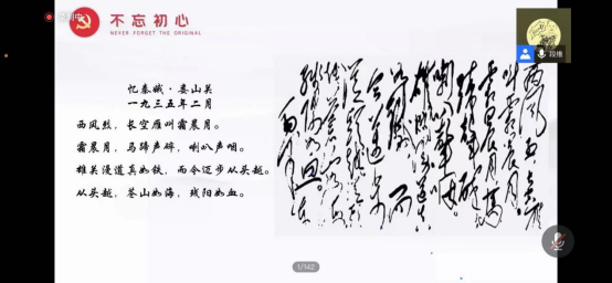 随后段维又旁征博引,诗词鉴赏穿插历史背景的讲述,生动的党史课带领大家“诗史合一”品味毛泽东诗词独特的艺术魅力,领悟诗词间磅礴大气的革命情怀,将毛泽东在翻越六盘山后所作的《清平乐·六盘山》中的“屈指行程二万”,与李白的《望庐山瀑布》中的三四句“飞流直下三千尺,疑是银河落九天”相对比,让大家深刻并形象的理解了长征的艰辛曲折,为了使观众更好的体会与理解诗词中藐视一切艰难困苦的意志,与毛泽东抒发出的无限豪情壮志,段维再次将李煜的《清平乐》“离恨恰如春草,更行更远还生”与毛泽东的《清平乐·六盘山》等诗句进行了解读。最后段维与大家一起解读了毛泽东具有总结性的《七律·长征》这首壮丽诗篇并分享了毛主席改诗的故事,诗词的灵动、史实的厚重和讲诉的真挚有机融为一体,使党史知识潜移默化、“声”入人心,会议至此圆满结束。