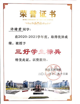 在学习上,许绪君刻苦努力,态度端正,讲究学习方法,注重学习效率,注意理论与实践的结合,注重学习能力培养。虽身兼数职,但始终将学习当成学生的本职工作,并秉持着“时间就像海绵里的水,挤挤总是有的”的观念。他积极参加各类学科专业竞赛,在大一时便有一年的实验室学习经历,自学Autocad、Solidworks、Proe、Pr等专业软件,并将其积极运用于专业学习和实验实训中。在老师指导下,许绪君积极参加各类学科竞赛,获得第14届全国大学生先进成图技术大赛省级个人全能二等奖、第13届全国3D大赛湖北省二等奖、大学生创新创业大赛校级立项并结题。
