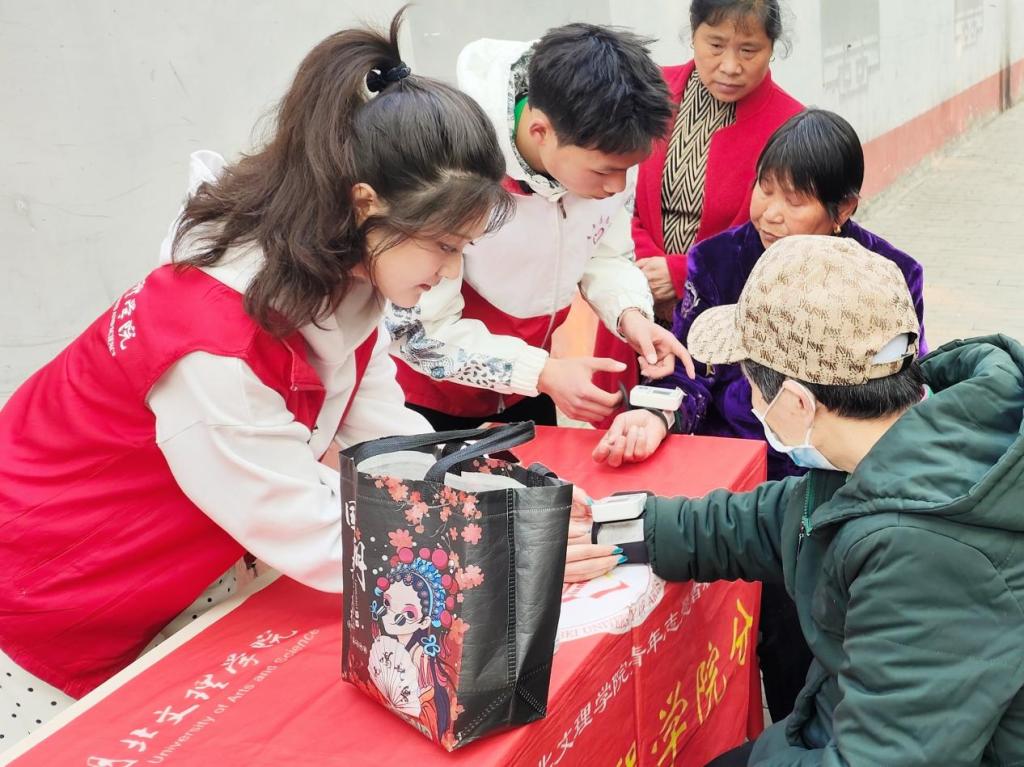 队员们熟练地运用血压计为老人们监测血压。他们还以测量结果为参考,围绕“疾病诱因”、“血压正常标准”、“缓解方法”等多方面为无法自主阅读的老人通过口述的方式,讲解“身患高血压、低血压应该如何科学的强身健体”,加强老人们对预防疾病知识的了解,促使共重新建立起好的生活习惯。